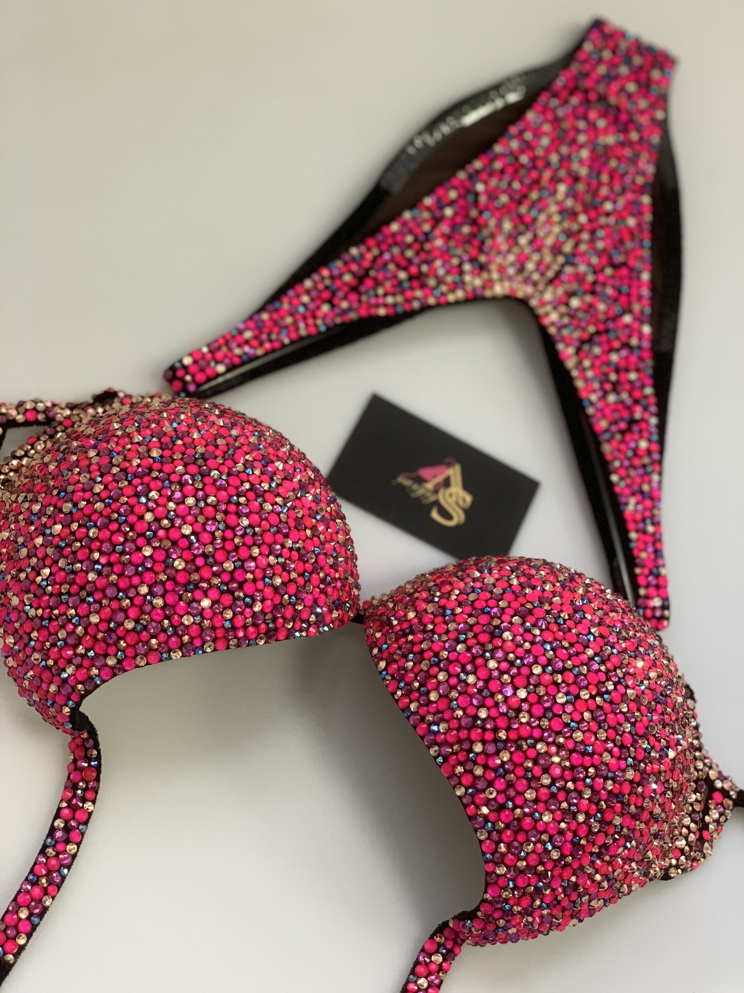 Все оттенки розового сошлись в этом привлекательном образе. Черная основа эффектно подчеркивает контраст. Вы будете в центре внимания!