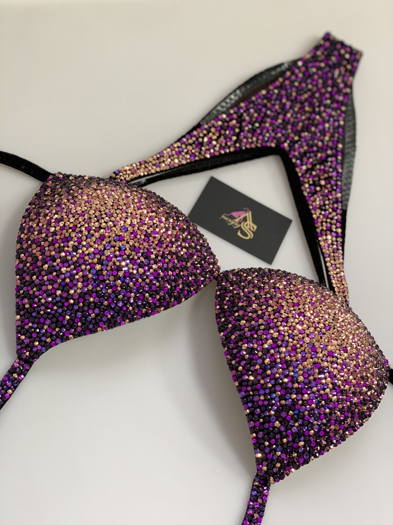 Основа — черный бархат, сочетание золотых страз и фиолетового электрика создает легкий и свежий лавандовый образ!